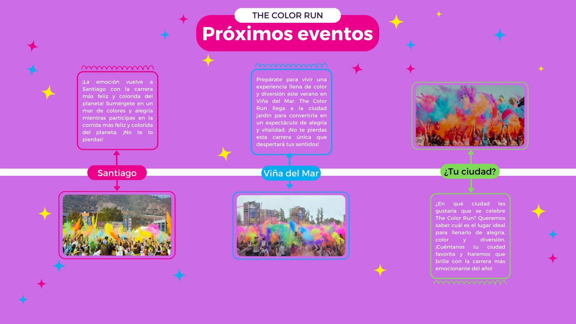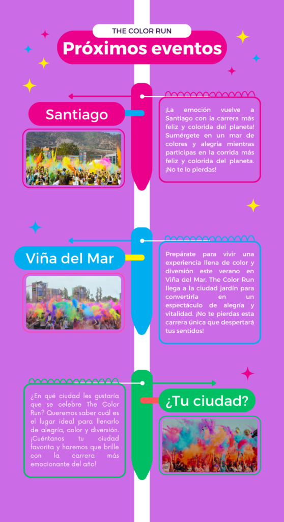 ¡Llamando a todos los soñadores, creyentes y hacedores de magia! Levántate y brilla con nosotros para los 5 km más felices del planeta. 2023 marca el décimo año de The Color Run en Chile, celebrando a aquellos que hacen que el mundo sea más brillante, más saludable y más feliz. Estamos ansiosos por HACER MAGIA, HACER RECUERDOS y HACER MÁS JUNTOS.